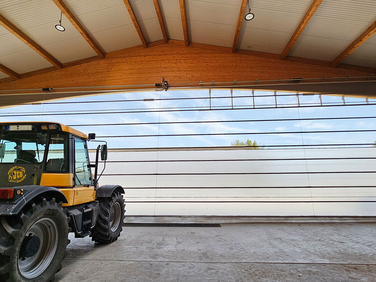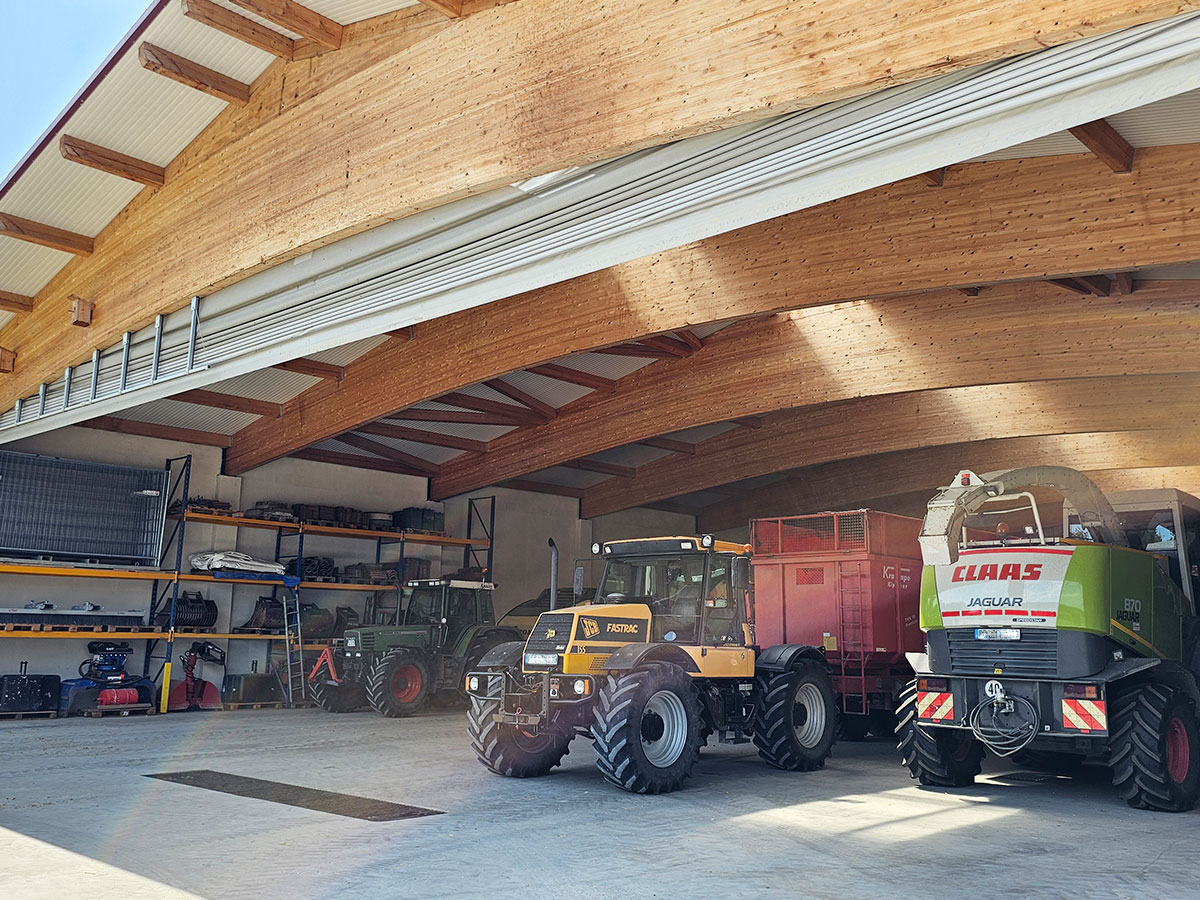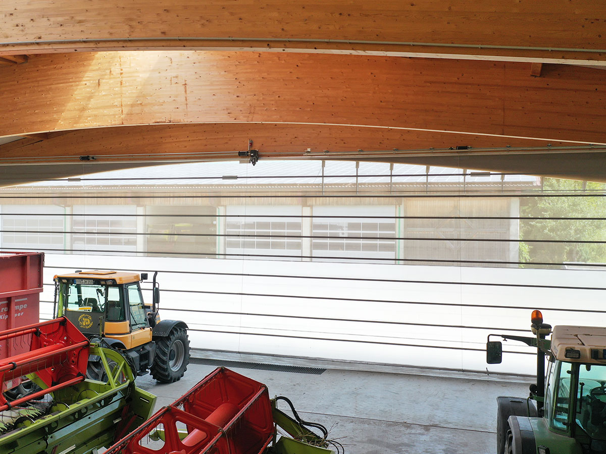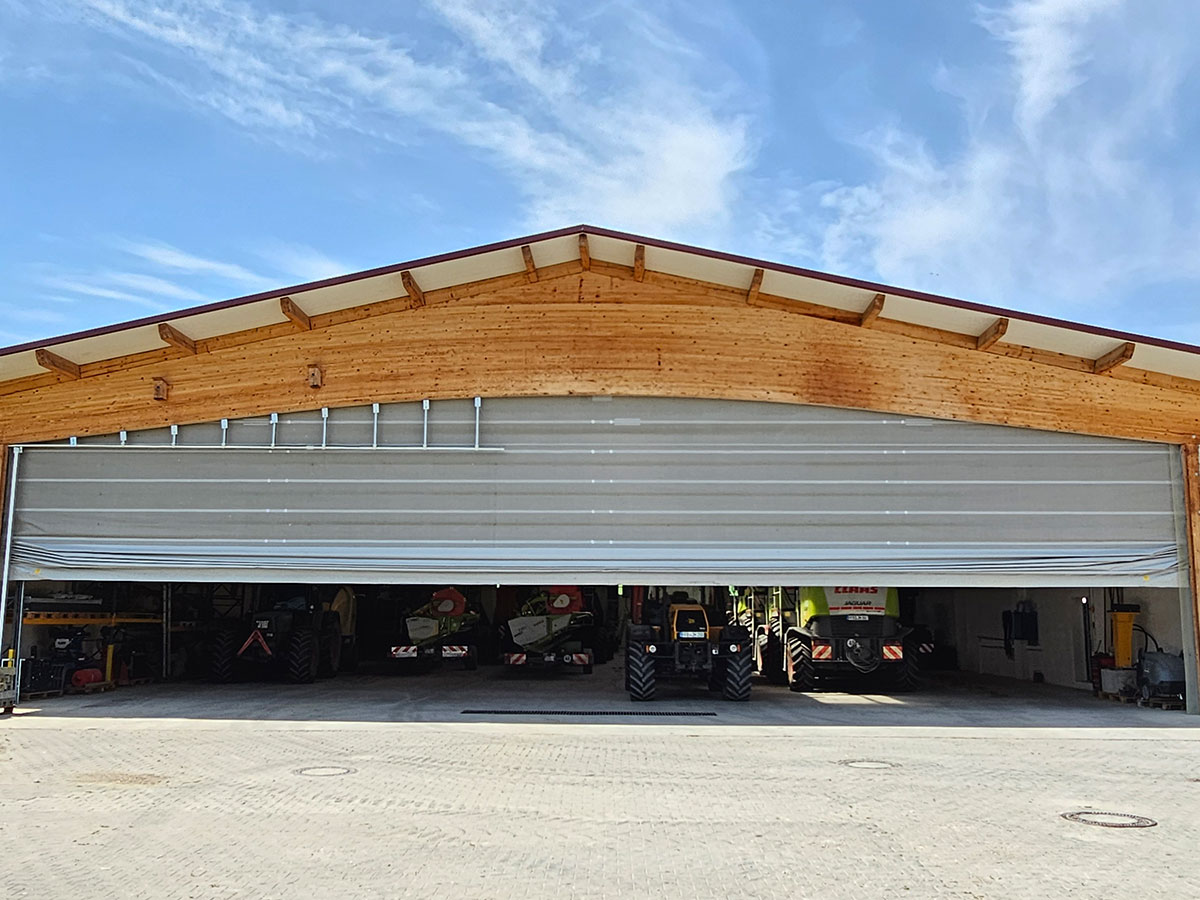Mit dem neuen 23 Meter breiten Windschutztor hat das Lohnunternehmen Hollinger eine Lösung erhalten, die exakt auf die Anforderungen eines modernen landwirtschaftlichen Lohnunternehmens zugeschnitten ist. Das elektrische Falttor ermöglicht nicht nur maximale Einfahrtsbreite, sondern sorgt auch für Helligkeit, Luftzirkulation und Betriebssicherheit innerhalb der Maschinenhalle. Das Ergebnis: eine Lagerhalle für Maschinen, die den Arbeitsalltag deutlich erleichtert und optimalen Schutz für die wertvolle Landtechnik bietet.