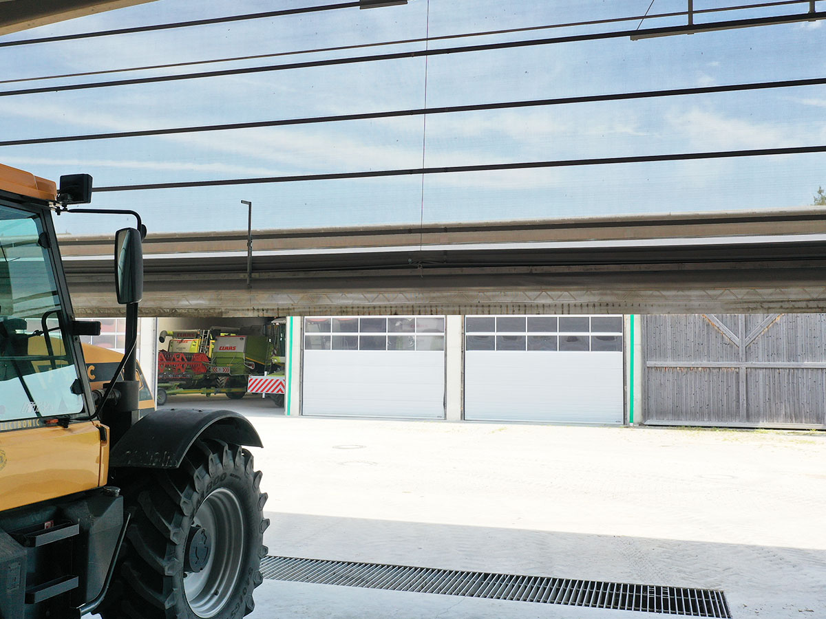 Neben den großzügigen Abmessungen punktet das Tor durch seine Konstruktion und die Materialauswahl: Der untere Teil besteht aus lichtdurchlässiger Windschutzplane, der andere Teil aus licht- und luftdurchlässigem Windschutznetz. Diese Kombination sorgt dafür, dass es in der Maschinenhalle auch bei geschlossenem Tor sehr hell ist. Gleichzeitig wird ein kontinuierlicher Luftaustausch ermöglicht – ein entscheidender Vorteil, wenn frisch eingesetzte Maschinen abgestellt werden und Restwärme entweichen muss.