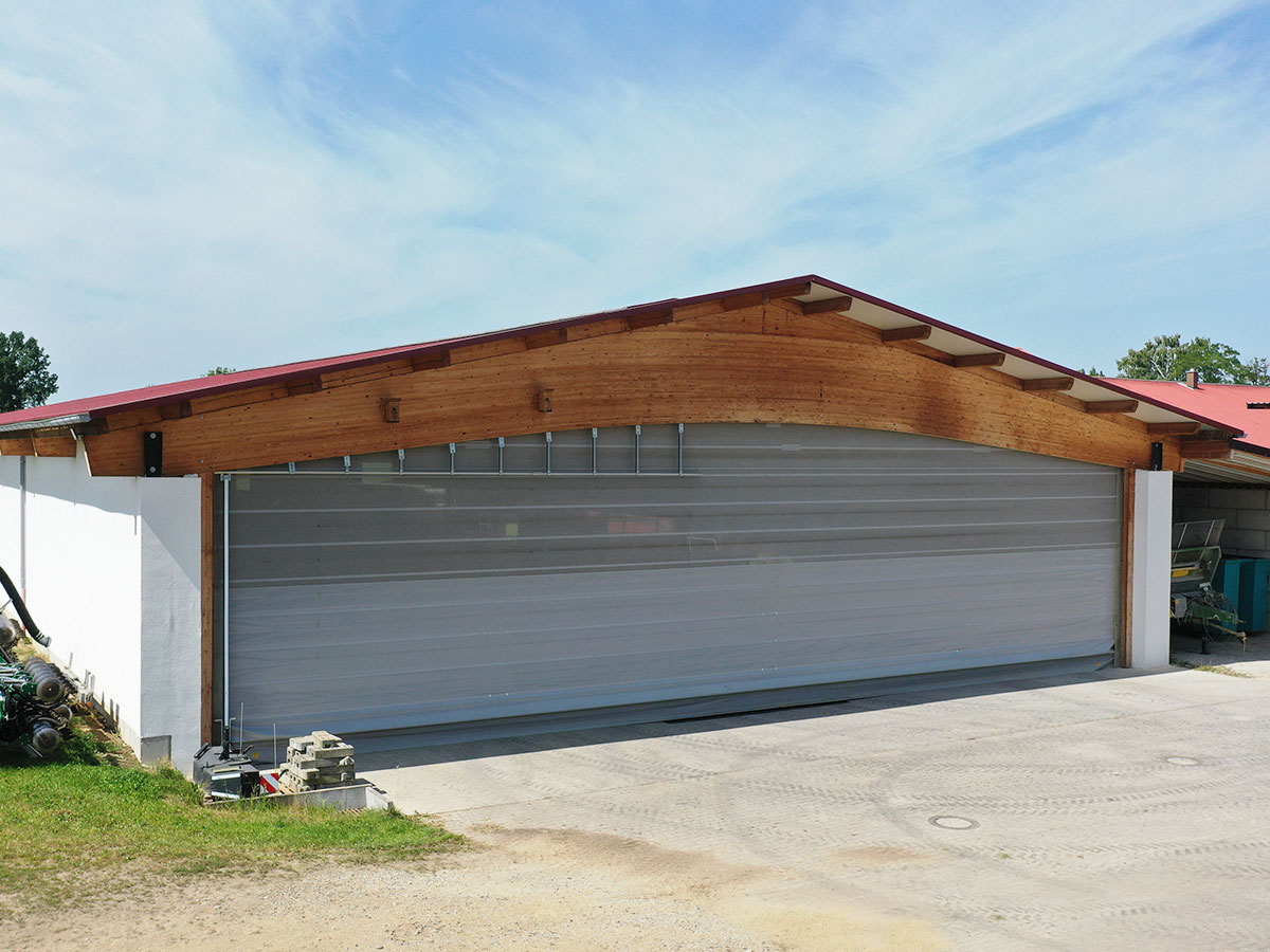 Für das Lohnunternehmen Hollinger in Landsberied realisierte AGROTEL ein freigespanntes Windschutztor mit 23 m Breite – ideal für große Maschinen.