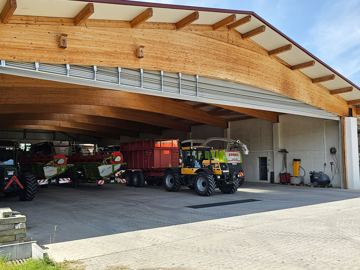 Das Besondere: Trotz der enormen Spannweite bleibt die Einfahrtsbreite voll nutzbar. Denn die mittigen Aussteifungsstützen lassen sich nach außen verschieben – so können selbst die größten Maschinen ohne Einschränkungen ein- und ausfahren.